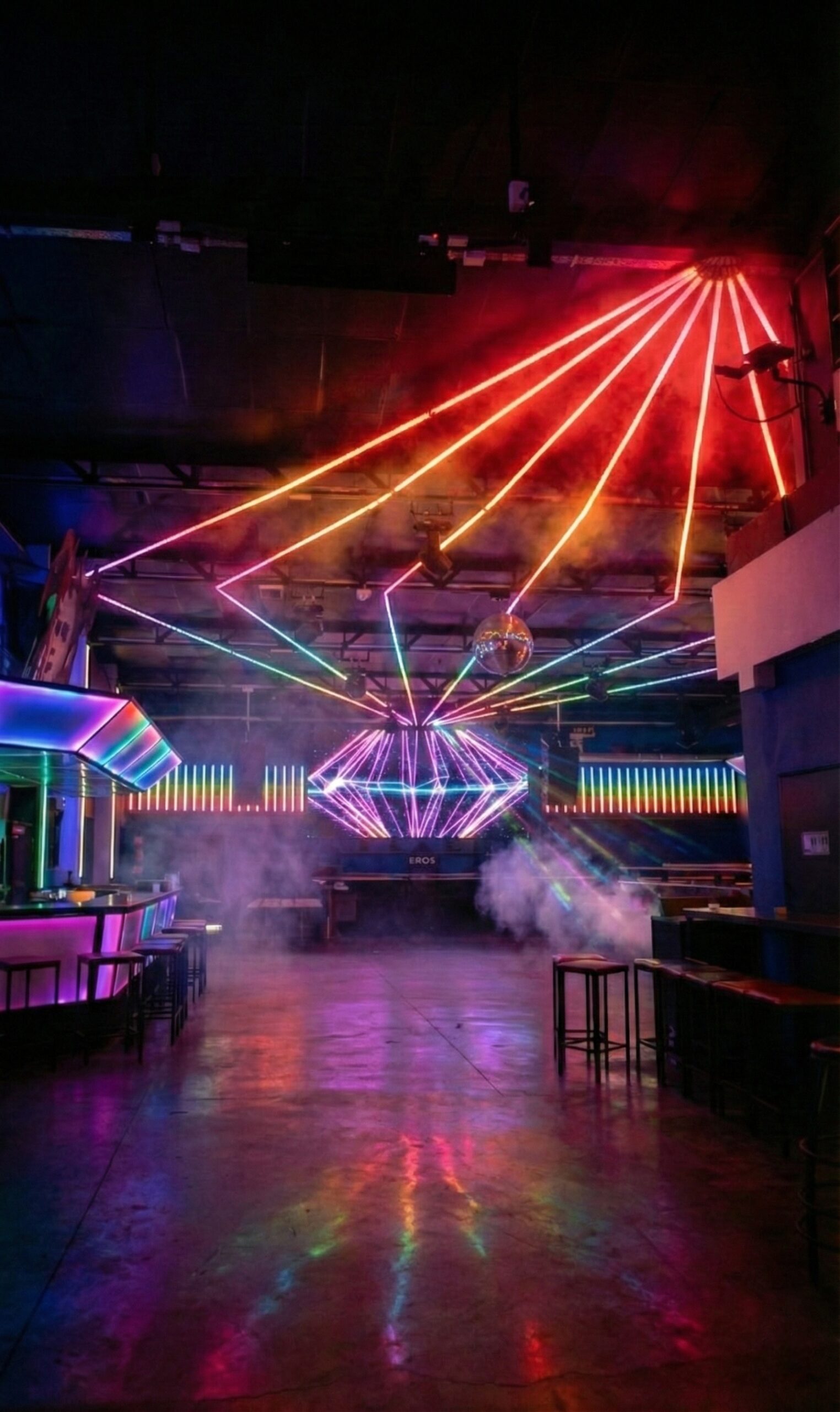 Cielo de Diamante: Diseñamos y fabricamos una estructura central para el techo, disponiendo nuestros tubos Pixel LED para formar una imponente figura de diamante que funciona como el corazón visual de la pista.