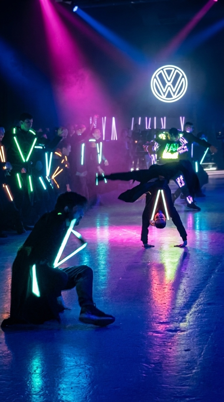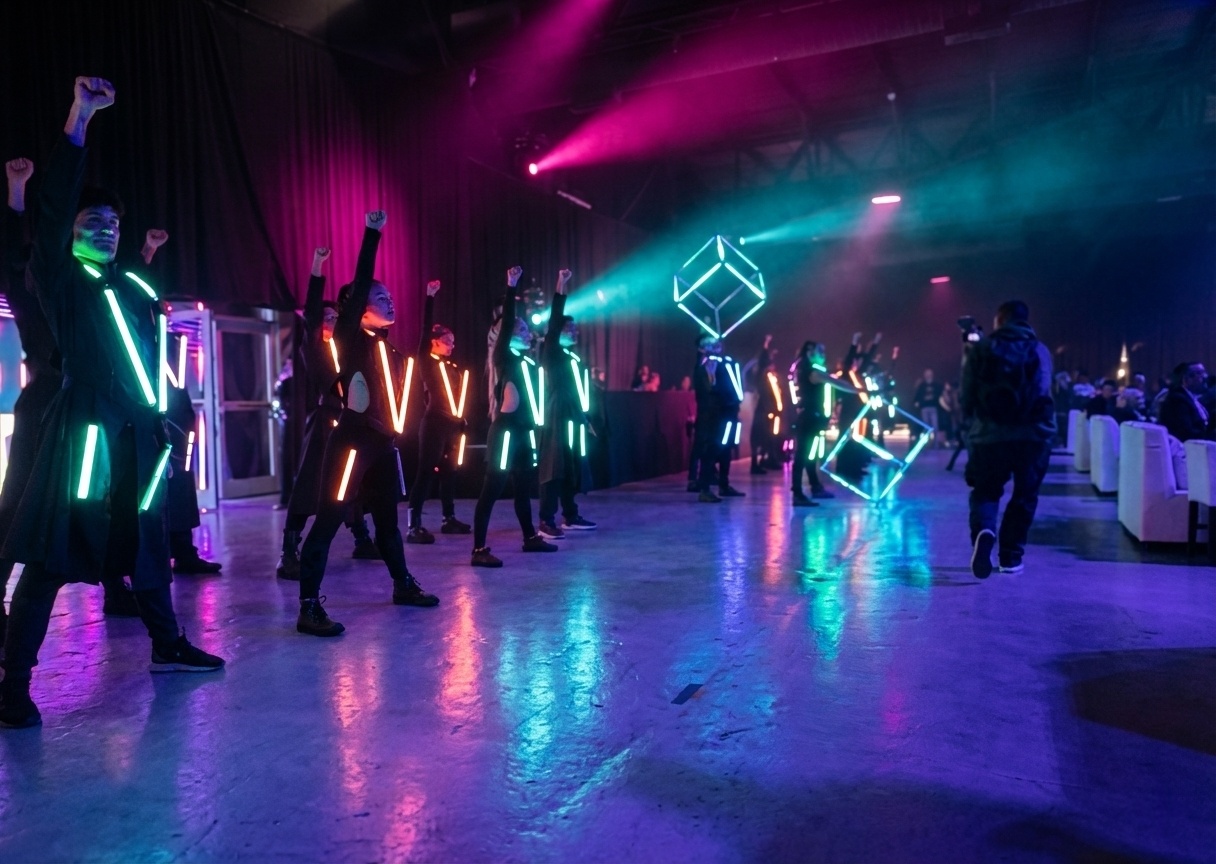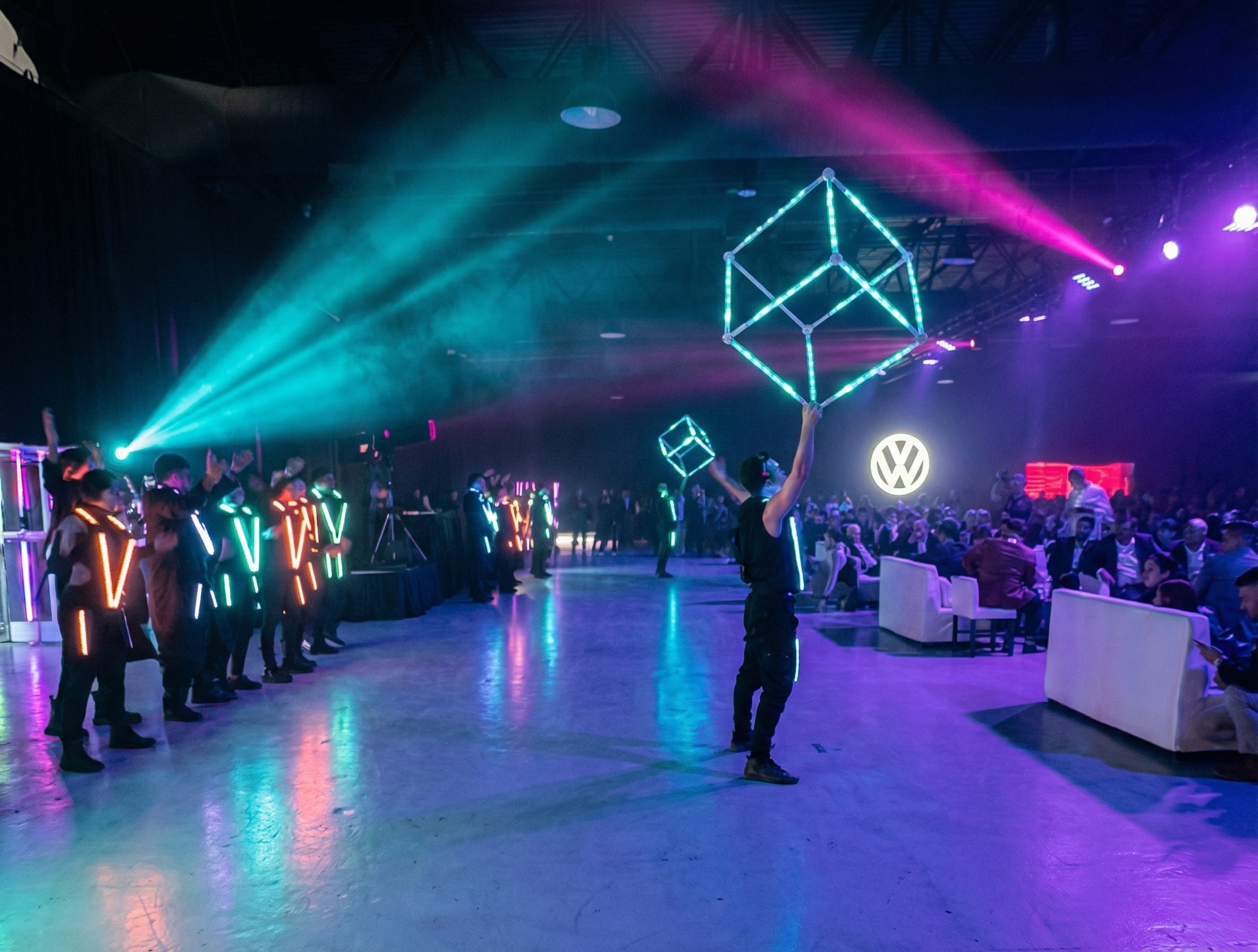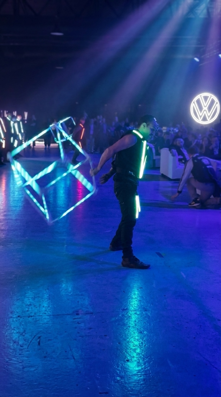 24 Trajes LED Custom: Diseñamos y fabricamos 24 trajes de tira LED de alto brillo para el staff del evento.